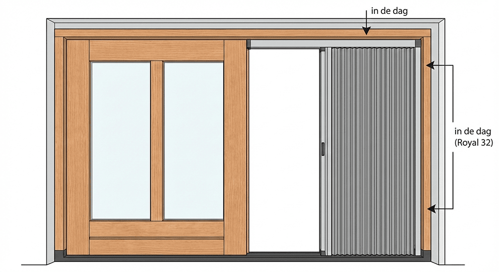 Zoals je op de tekening hieronder ziet, ligt de hordeur dan ‘diep’ in het kozijn, op dezelfde lijn als de vaste deur. Als je de hor dichttrekt, sluit de treklijst naadloos aan tegen de middenstijl van de andere deur. Probleem opgelost!